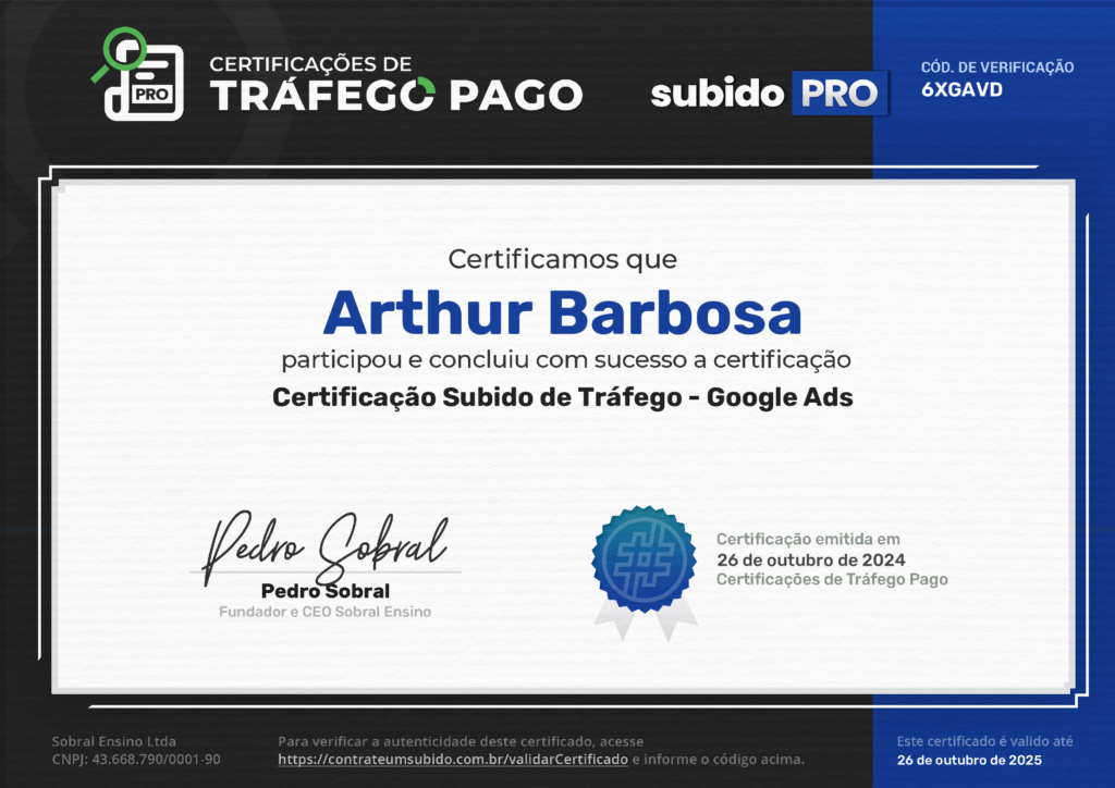 Hoje faço parte do maior programa de treinamento e mentoria da América Latina, o Subido PRO, não só para aumentar meu nível profissional, como também oferecer àqueles que confiam em meu trabalho, os melhores resultados possíveis.