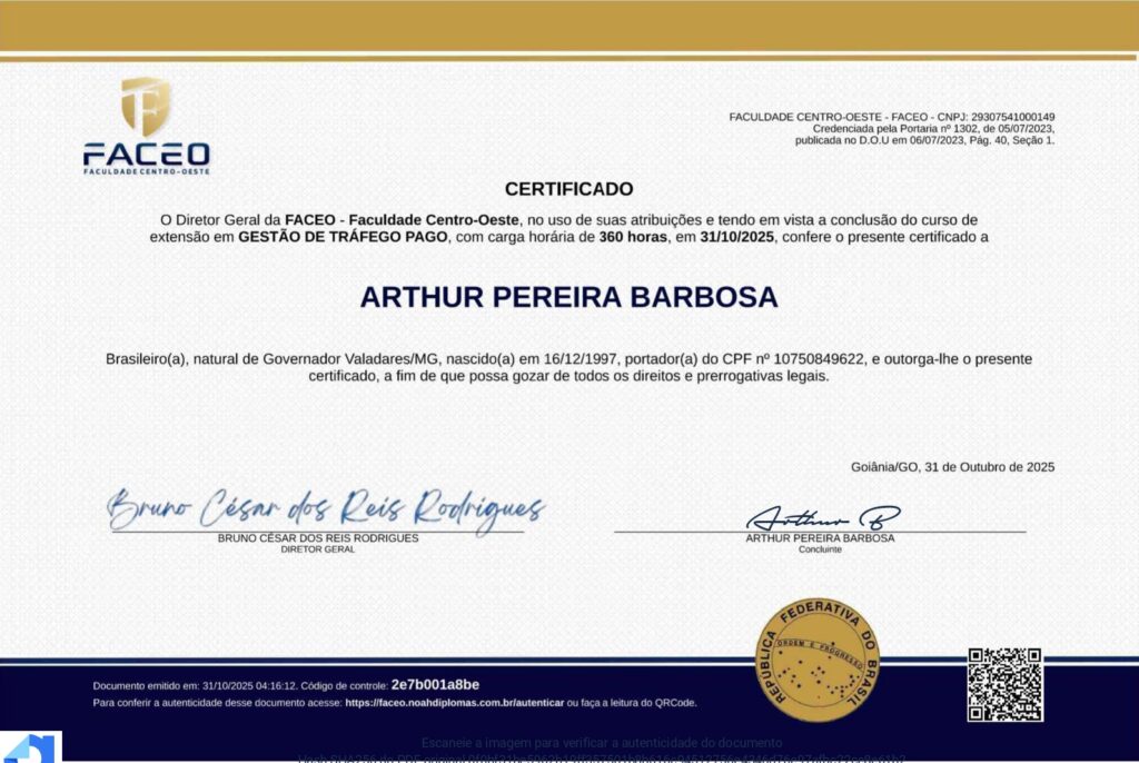 Arthur Barbosa – Fundador da URSA Analytics e estrategista de marketing digital para negócios locais. Atua com gestão de tráfego desde 2020, ajudando empresas a conquistarem mais visibilidade, previsibilidade e crescimento real através da internet.